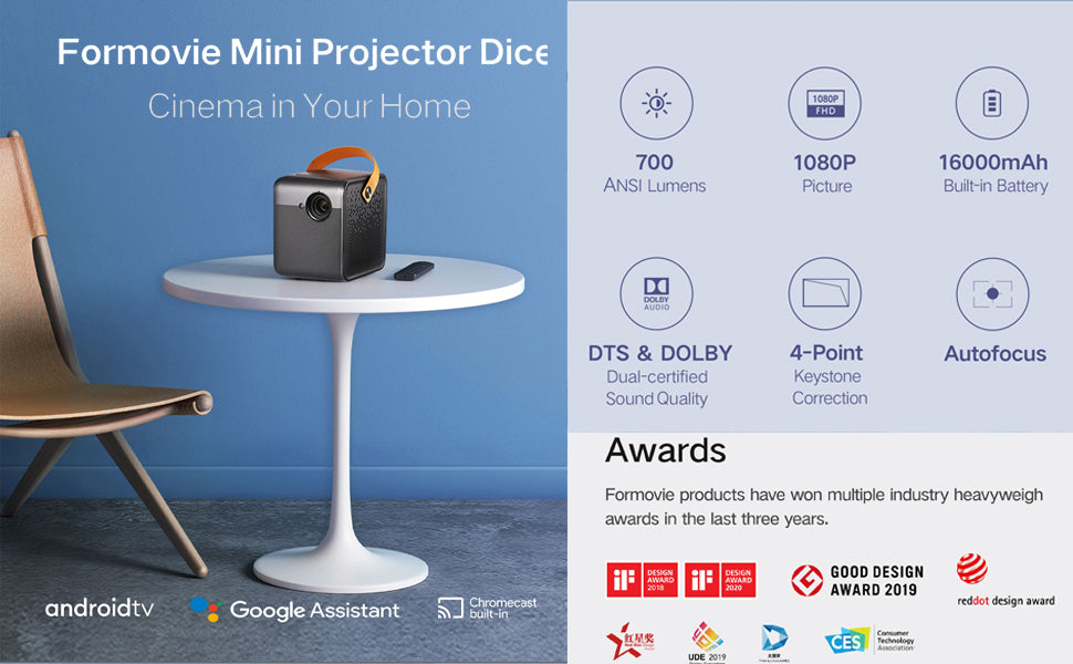 Formovie Dice Mini Portable DLP Projector Native 1080p 700 ANSI LUMENS VYBAVENÍ V ASSISTANCE Google
