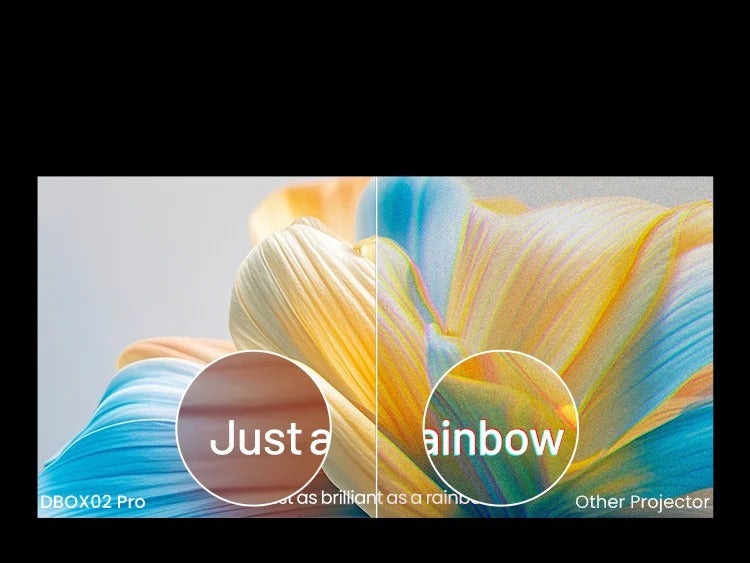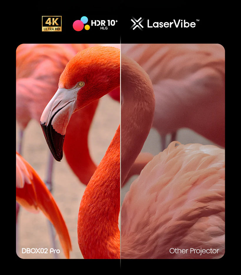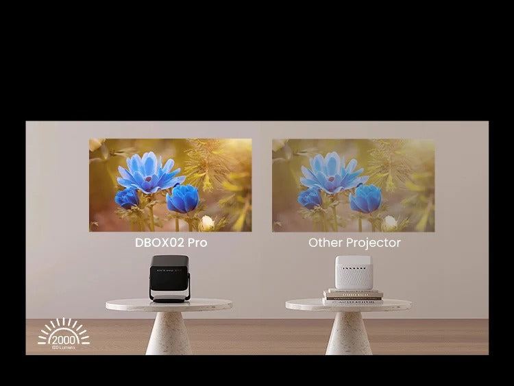 Brightness meets brilliance. The DBOX02 Pro’s high-power 2000 ISO Lumens laser engine delivers vibrant 4K visuals, even in bright rooms. No more dim or washed-out images, every frame pops with sharp detail and vivid colors. Perfect for home theaters, gaming night, or outdoor movie magic.