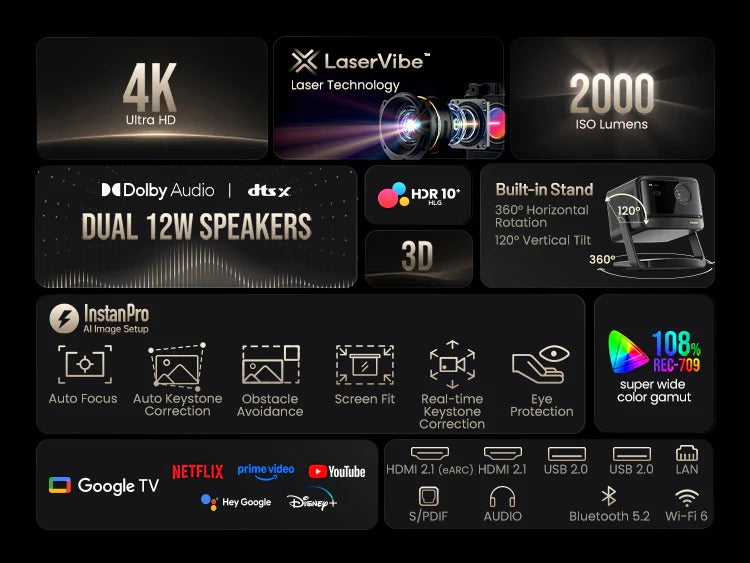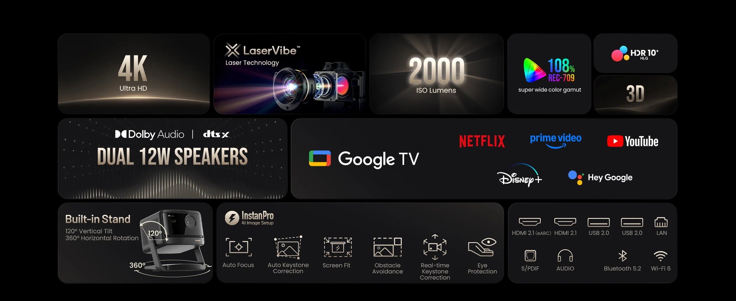 - True 4K Laser Projector with HDR10+ & 2000 ISO Lumens