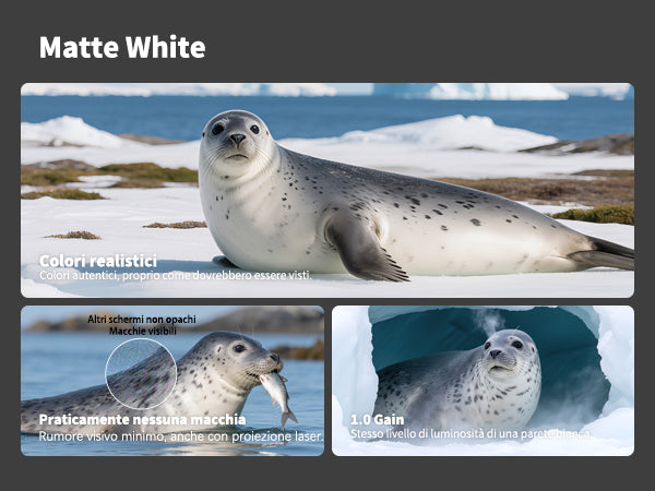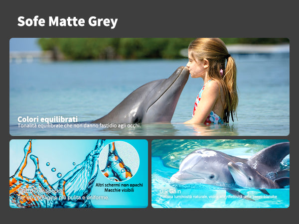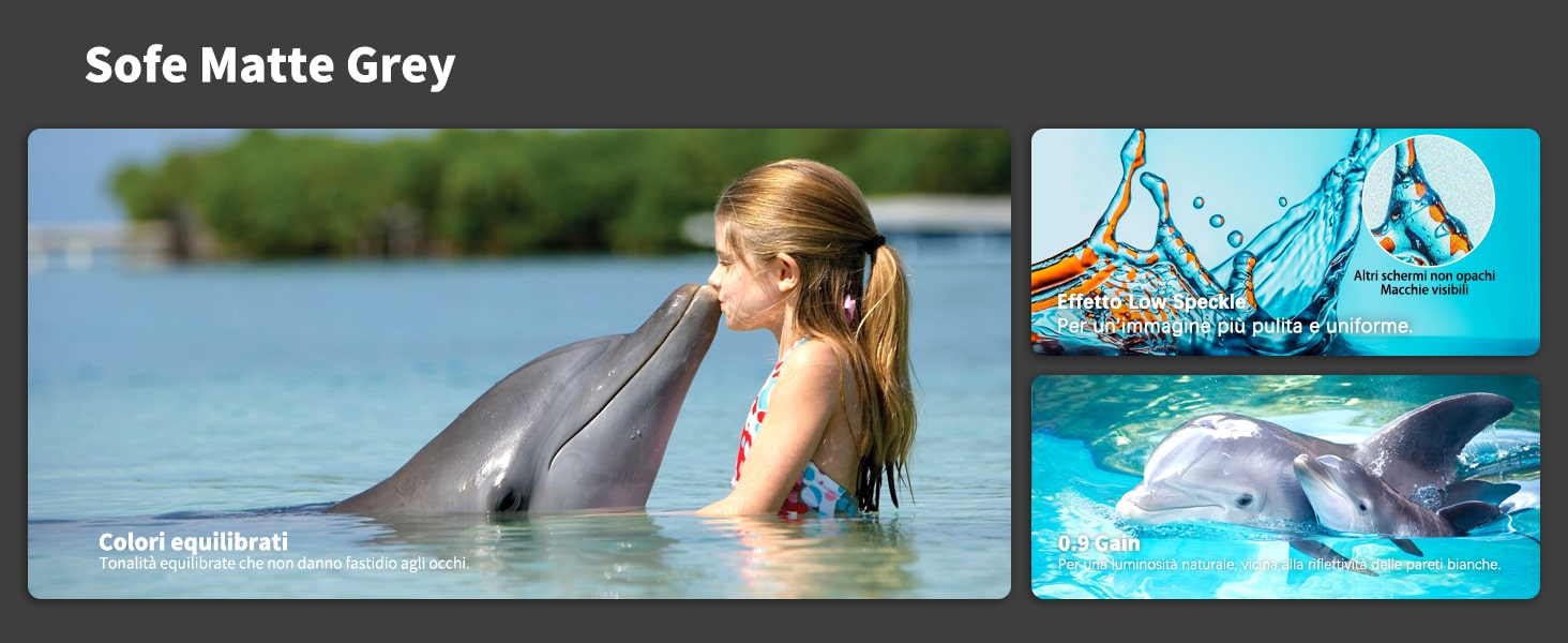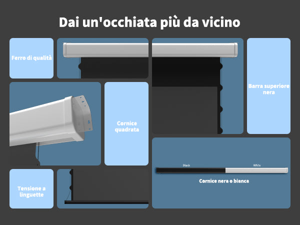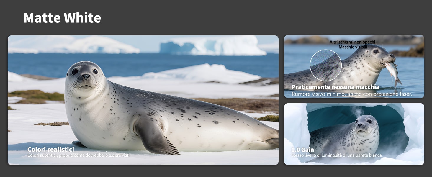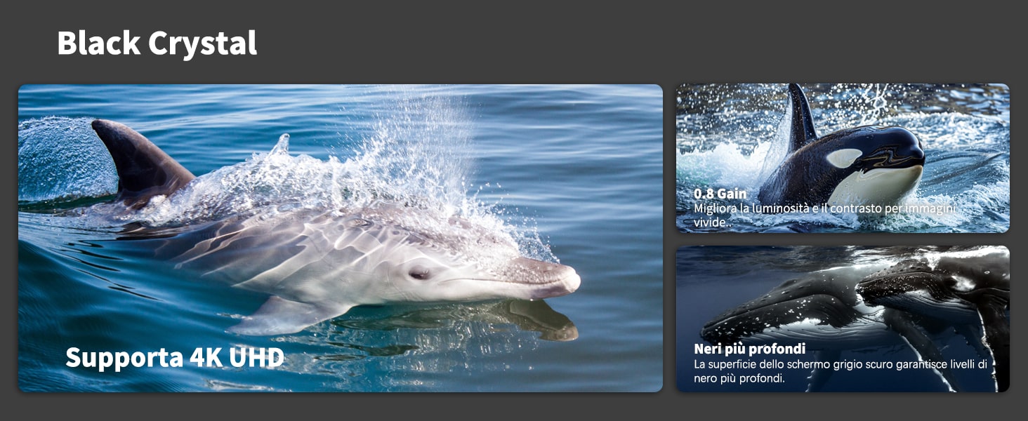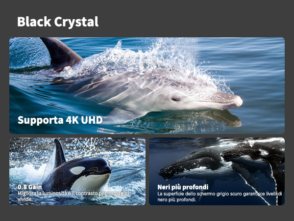 - Tessuto dello schermo di cristallo nero: materiale dello schermo ALR (Ambient Light Rejecting) a lunga gittata, guadagno: 0,9, 70%ALR (Ambient Light Rejecting)