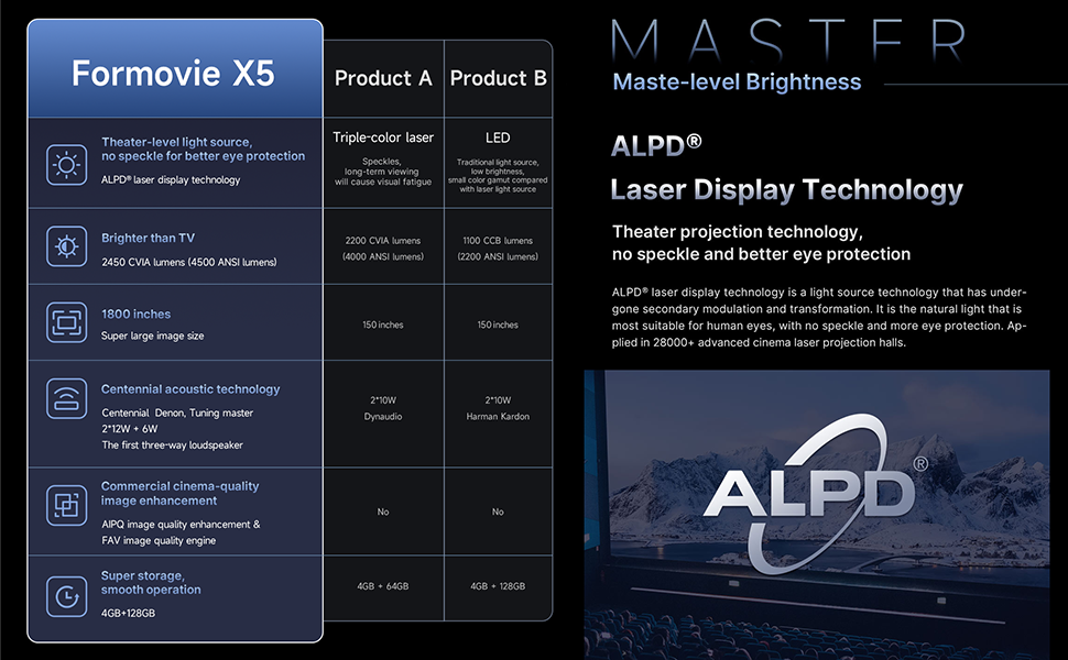 Formovie X5 Prawdziwie kinowy projektor laserowy 4K 2450 CVIA Lumenów ALPD Przenośny projektor z HDR10+ Głośnik MEMC Denon