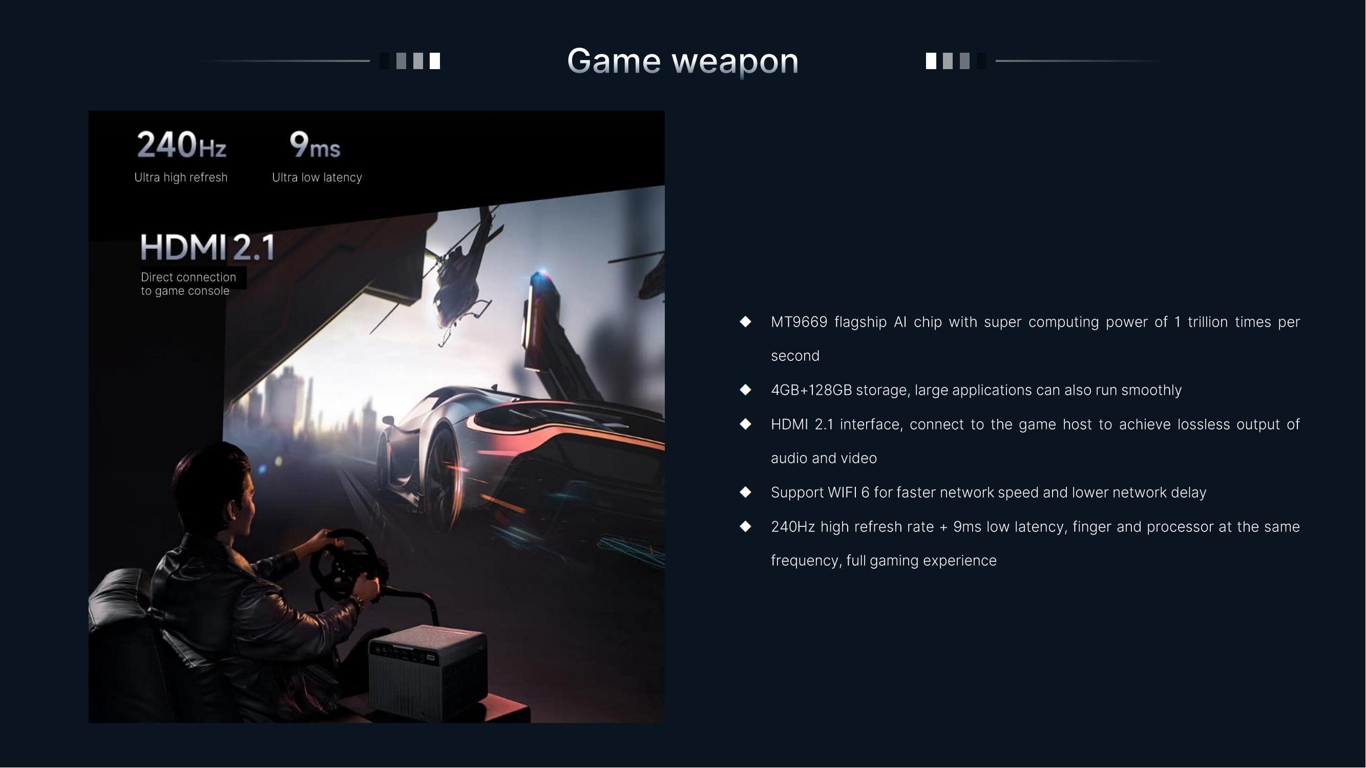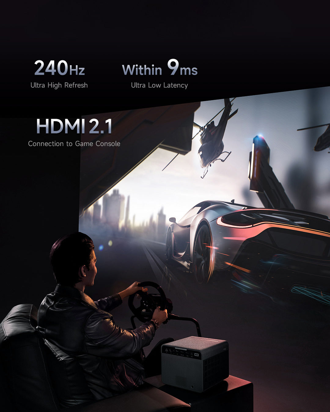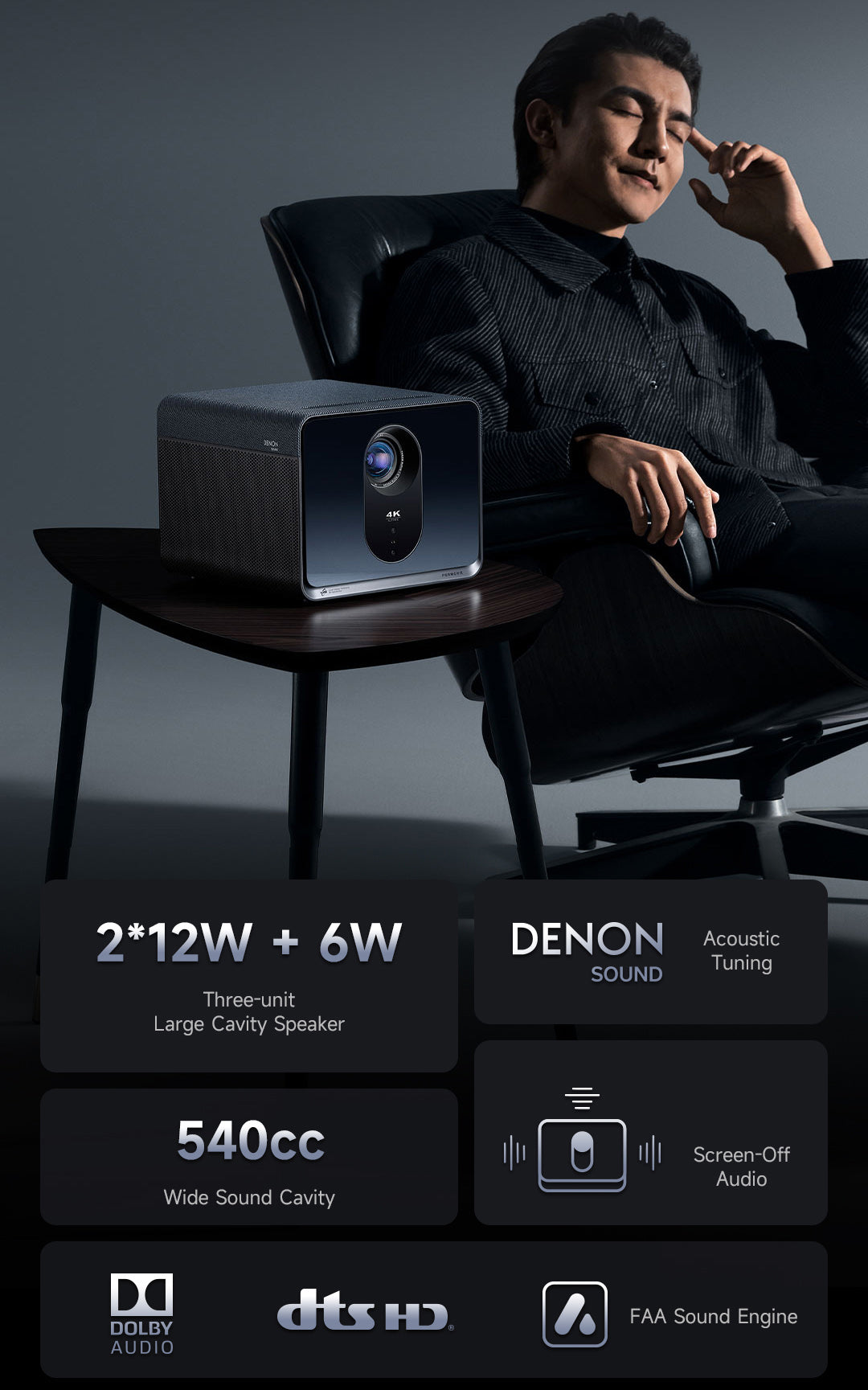 Precision layout of the internal spatial structure, subverting the limits of pro jection sound. Equipped with built-in 12W ultra-large speakerson the left and right sides and an additional 6W full-frequency speaker at tthe rear, it provides a more even sound field and has a 540cc wide sopund cavity, with rich and mellow bass and ethereal treble.