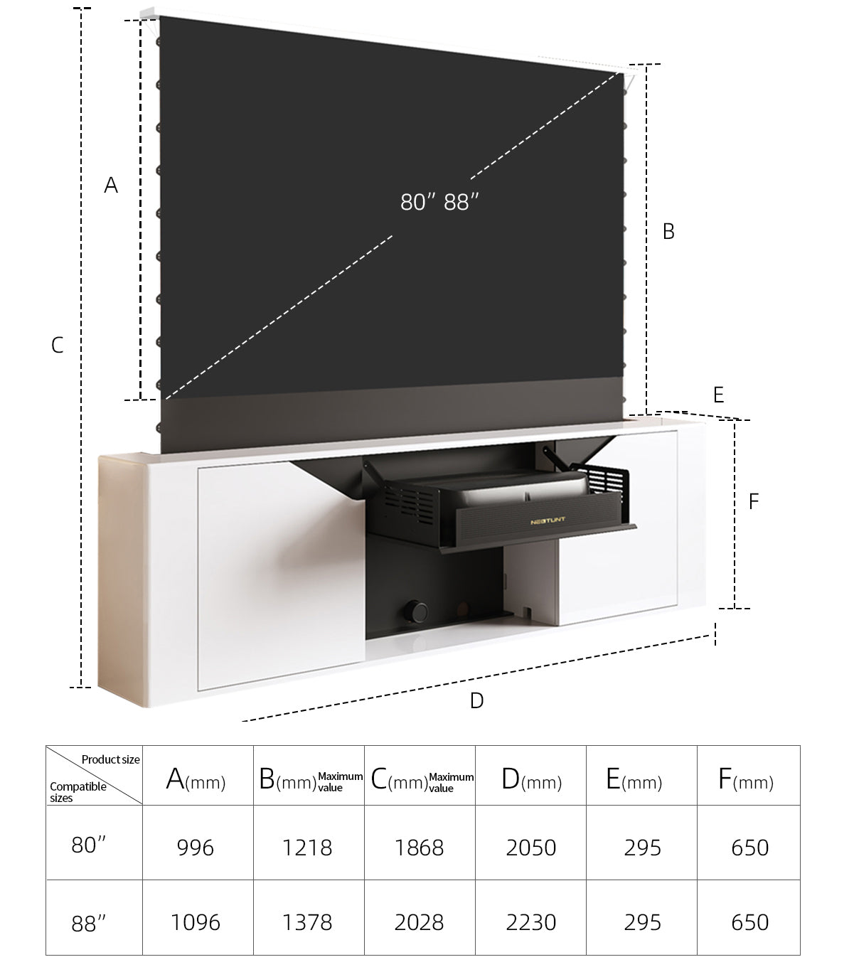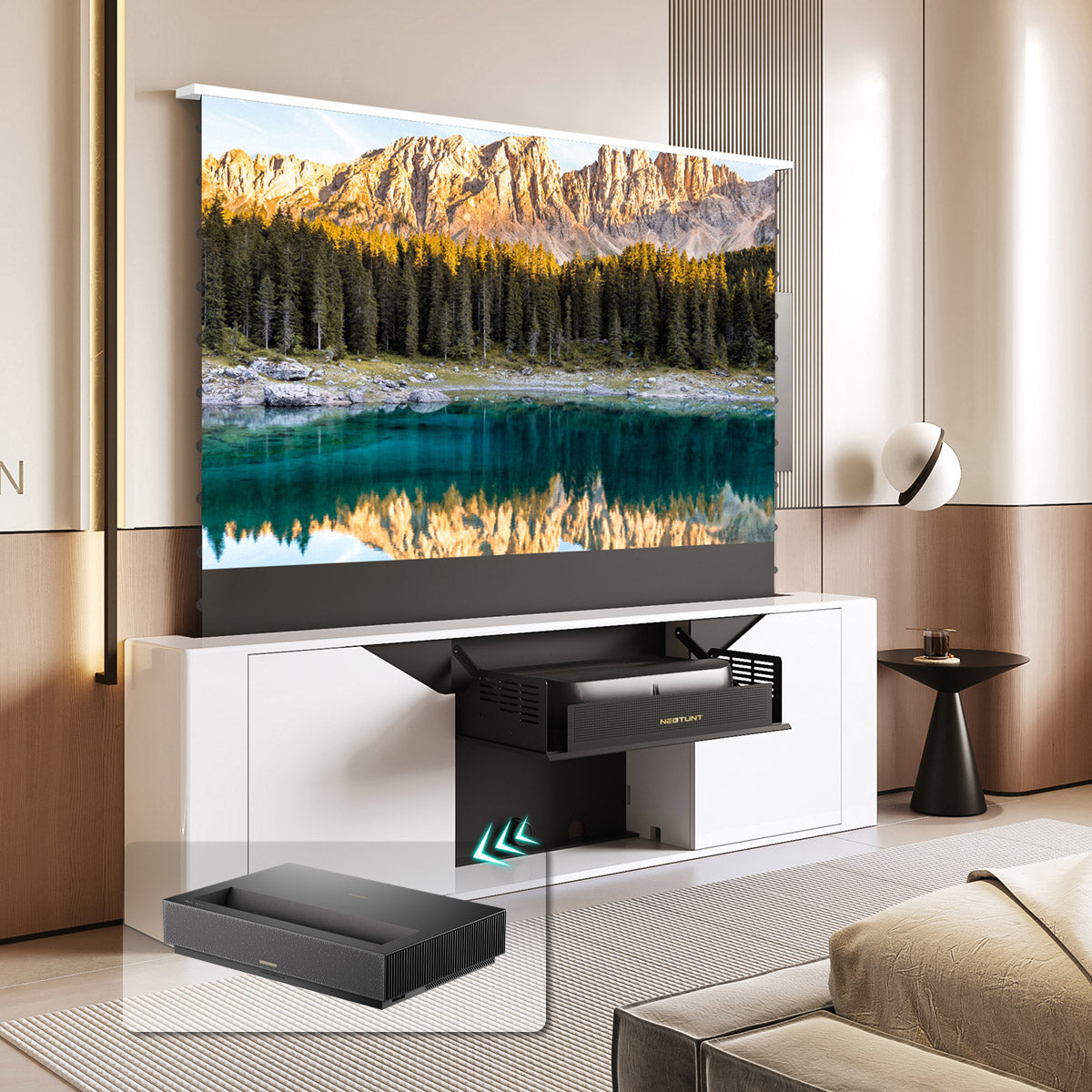 • Smart Integrated System:Equipped with a motorized lift mechanism, intelligent control, and silent motion technology — the cabinet automatically conceals or reveals your projector with a single command.